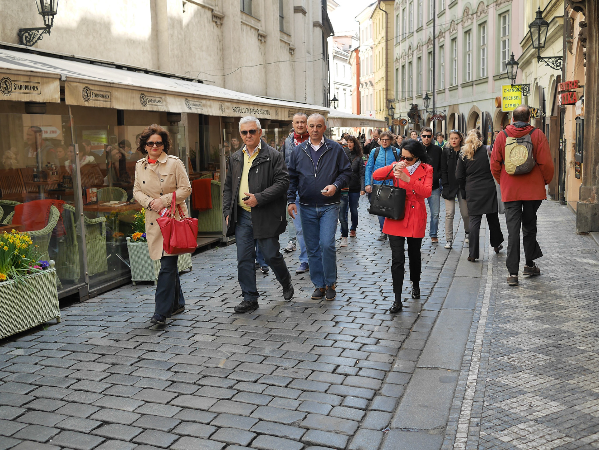 Having landed in Prague in the morning, we decided not to waste a day getting over the jet lag and went straight to the Old Town Square. There we saw tourists (and locals) -- riding Segways, bicycles, taking pictures, etc. I bet in this picture the person walking with a phone to her ear is a local.